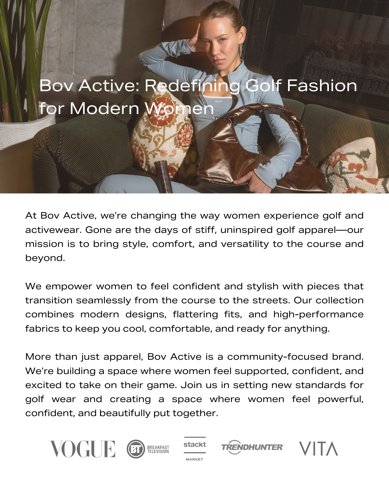 Bov Active is a golf athleisure brand that provides versatile and fashion-forward pieces that seamlessly transition from golf and tennis to everyday wear.